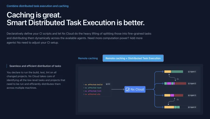 This latest release of Nx Cloud comes with a new, streamlined design that offers users a more modern and visually appealing experience. This includes the main Nx Cloud website, where we improved our messaging, including interactive visualizations to better explain some core concepts around remote caching and distributed task execution.